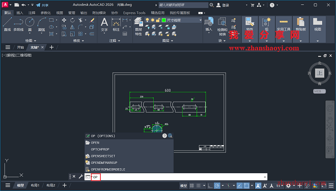 1、先打开AutoCAD 2026软件,打开如下示例图纸,然后在下方命令栏中输入:OP,然后按Enter键;