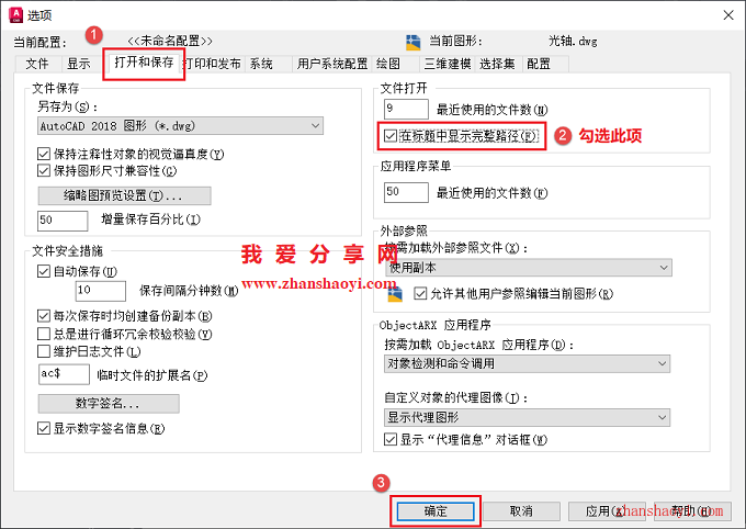 2、打开如下对话框,先点击【打开和保存】选项卡,然后勾选【在标题中显示完整路径】,点击【确定】退出;