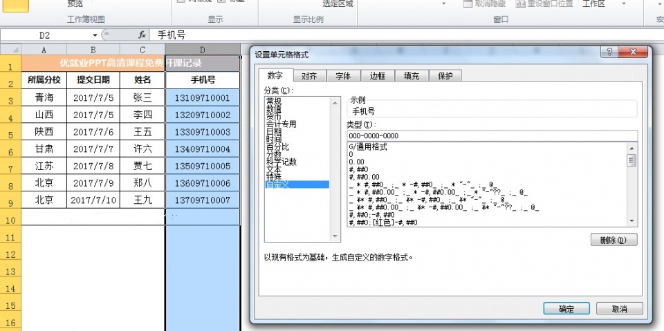 在Excel使用中,在表格中记录手机号是非常常见的操作,一贯的做法就是直接输入手机号,表格中显示为连续的11位数字,但是你肯定也见过有些人就能将手机号显示的特别漂亮,比如显示为130-0000-0000,那么怎么可以快速实现这个形式呢?