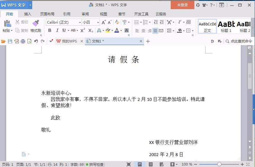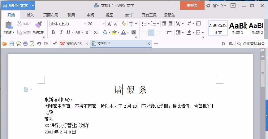 3、选中请假条,然后选择居中对齐,并多次点击“增大字号”,使文字大小合适为止,