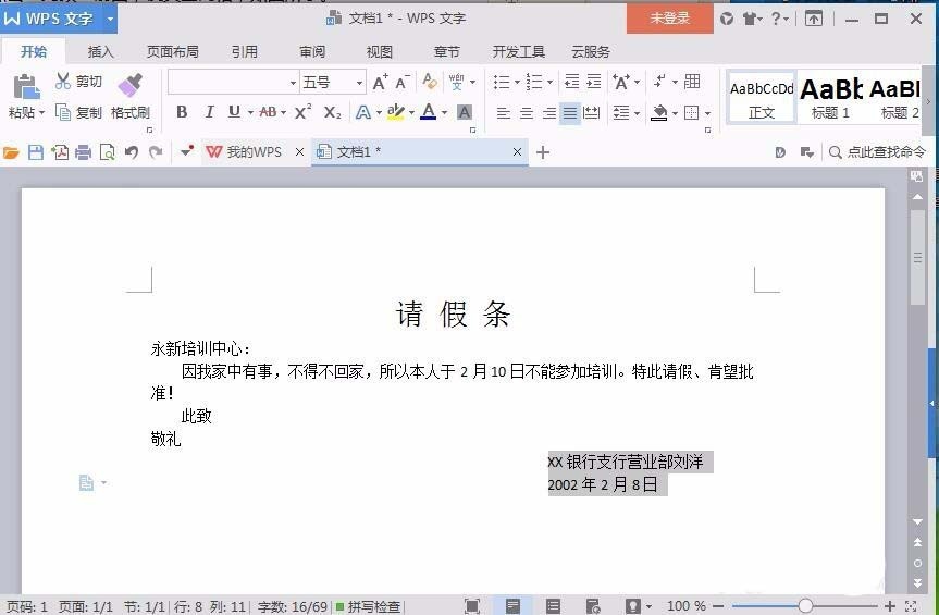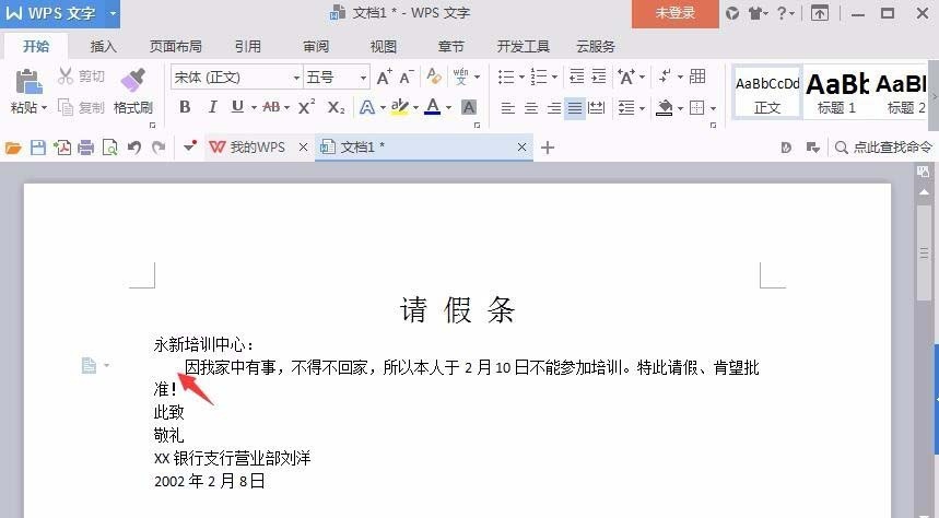 4、在“请”和“假”之间分别增加一个空格,如图所示。